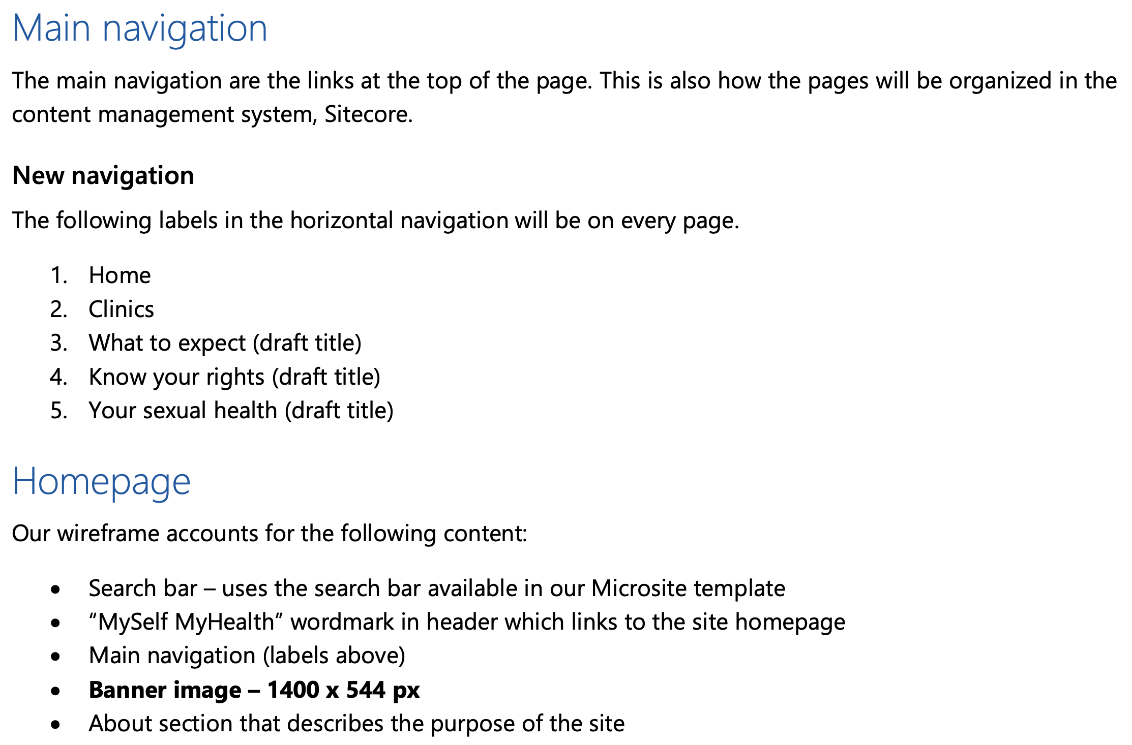 In one part of our design process, we mocked a content strategy document that addressed navigation. The current navigation had no “Home” navigation page, it was also confusing with “Clinic list”, “Clinic lowdown” and “Trusted sources” pages that weren’t very user friendly. Users visiting the website for the first time had no idea what those meant nor how to get back to the home page.