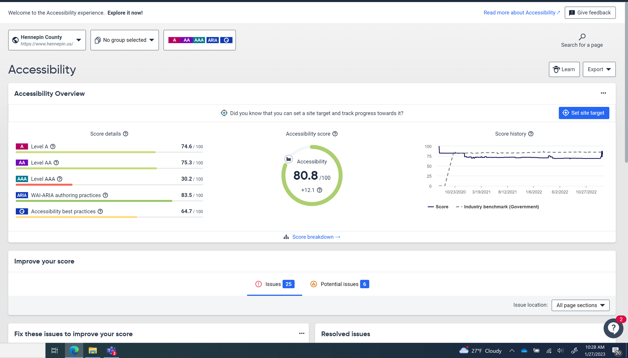 Through SiteImprove and working with our developer, we were able to resolve quite a few level A and AA issues. We prioritized level A issues first as shown in the powerpoint slide image to the bottom left and were able to resolve 4289 issues that were affecting 3710 pages after Q1. We were also able to bring up our Hennepin county site up to speed with other government sites in terms of accessibility conformance.